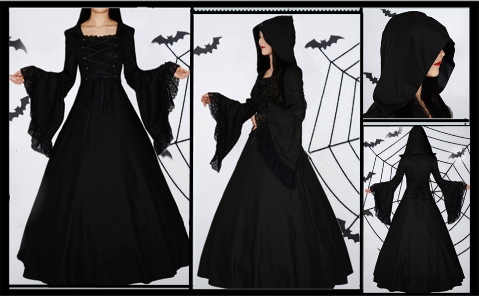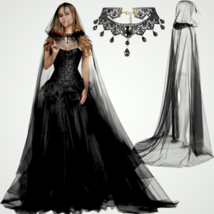 Immerse yourself in a tale of dark romance and aristocratic decay. This Victorian-inspired gown is a masterpiece of detail, featuring a lace-up corset bodice, rich velvet or brocade fabrics, and dramatic bat-wing sleeves. Complete with a draped hooded cape, this costume is perfect for anyone looking to make a deeply atmospheric and enchantingly dark statement.